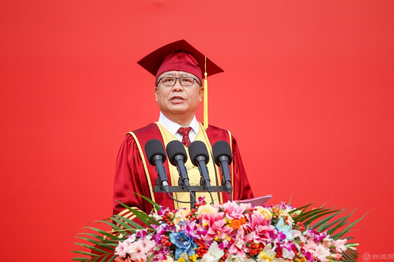 党委副书记、校长张立峰致辞。他祝贺2024届学生顺利完成学业,并现场做一次特殊的“点名”,向典礼当天生日的12名同学送上真挚的祝福。他表示,北方工大是同学们筑梦远航的起点、收获同学情谊的圣地,“青春工大”将成为大家人生中意义非凡的难忘经历。张立峰与师生共同回顾四年难忘的校园生活,赞扬同学们面对疫情肆虐时的挺膺担当、完成学业时的刻苦钻研、开展科学研究时的拼搏进取、投身“四大节”全面成长成才的激情绽放、面对挫折困难时的迎难而上,他动情地点出在各个领域表现优异的学生名字,将赞美和掌声送给他们,让同学们带着骄傲和荣耀告别母校。