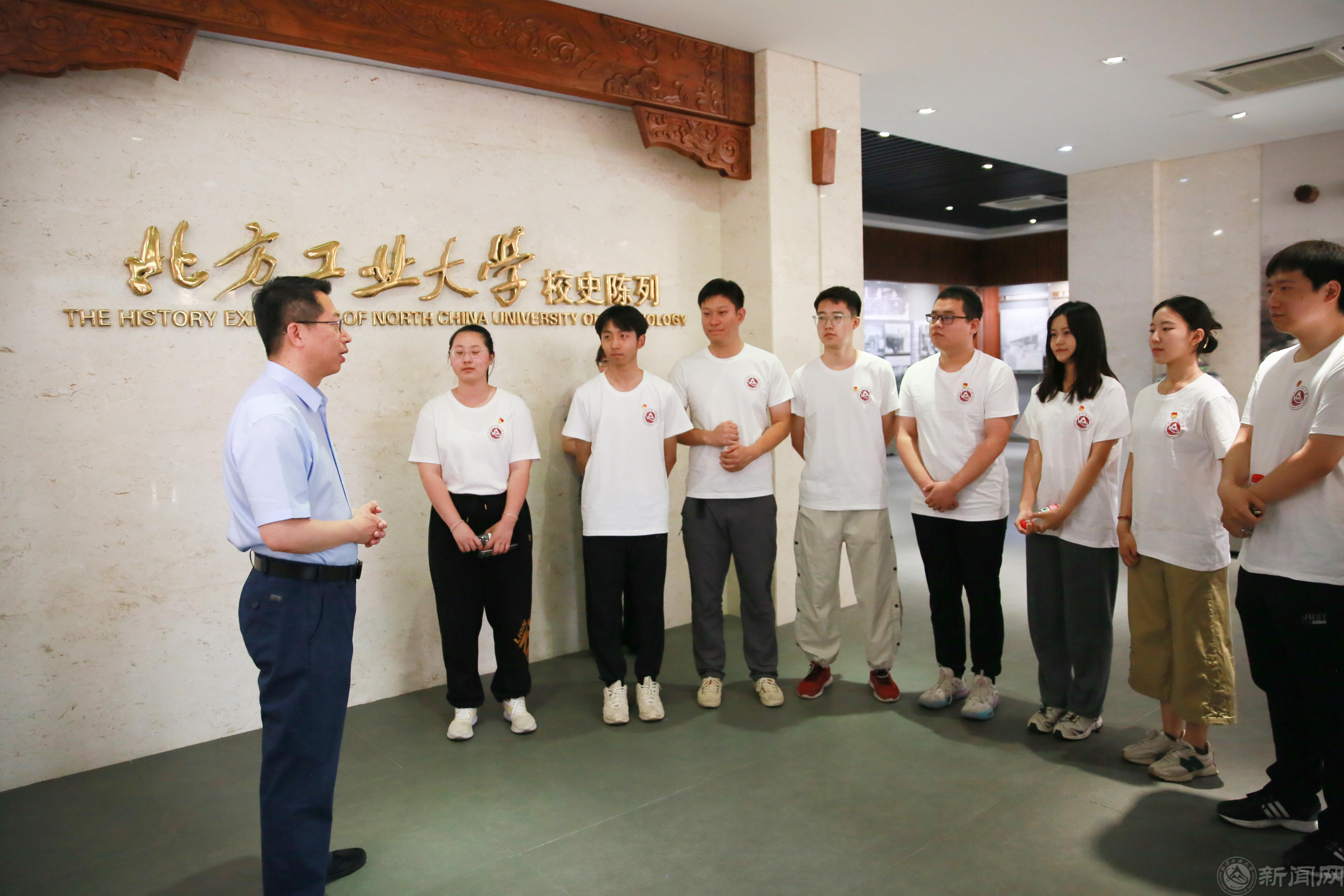 缪劲翔带领毕业生代表一起走进校史馆重温校史,共同回顾学校七十余载兴工报国路。缪劲翔指出,校史是学校成长发展的刻录,是校园文化精神的载体。他从“传承兴工报国精神”“追忆先贤光辉事迹”“青春建功新时代”三个方面,重点回顾了我校在77年办学历程中,始终传承“工业报国、工业兴国、工业强国”的精神血脉,聚焦国家战略发展需要加快人才培养的奋斗历程;生动介绍了我校首任校长陈光熙一片赤诚心向党、兴工报国育人才,齐东旭教授潜心钻研计算机图形学领域,科研精神薪火传,仇春霖先生打造美育研究高地、创工科院校美育先河的感人事迹;深情讲述了新时期北方工大人不忘初心使命,主动对接国家和北京市经济社会发展新要求,开启全面建设高水平应用型大学新征程的不懈努力,希望青年学生深入思考教育强国,青年何为,民族复兴,青年何为,坚定理想信念,敢于实干担当,争做时代新人。
